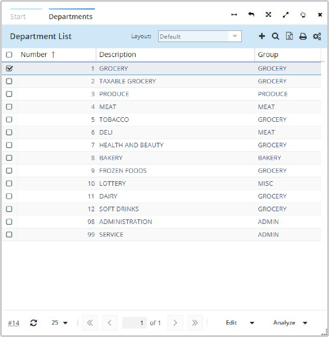 The Department table contains information for groups of items like taxability or restrictors. Some points of sale, especially cash registers, use department keys to sell non-coded items. The eSuite software uses departments to group coded items and direct key sales for reporting.
