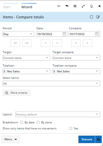 The Compare totals wizard offers criteria selection that includes movement, departments, sub-departments, family code, category code, report code, vendor code and batches. It allows breaking down the information by store, by date and only items with no movement. Criteria related to movement and item may be added with the Add criteria button.