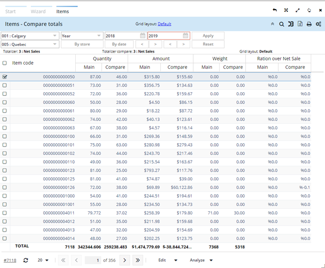 The Compare totals report displays transaction quantity and total sales from one store compared to another and/or a totalizer compared to another, by item.